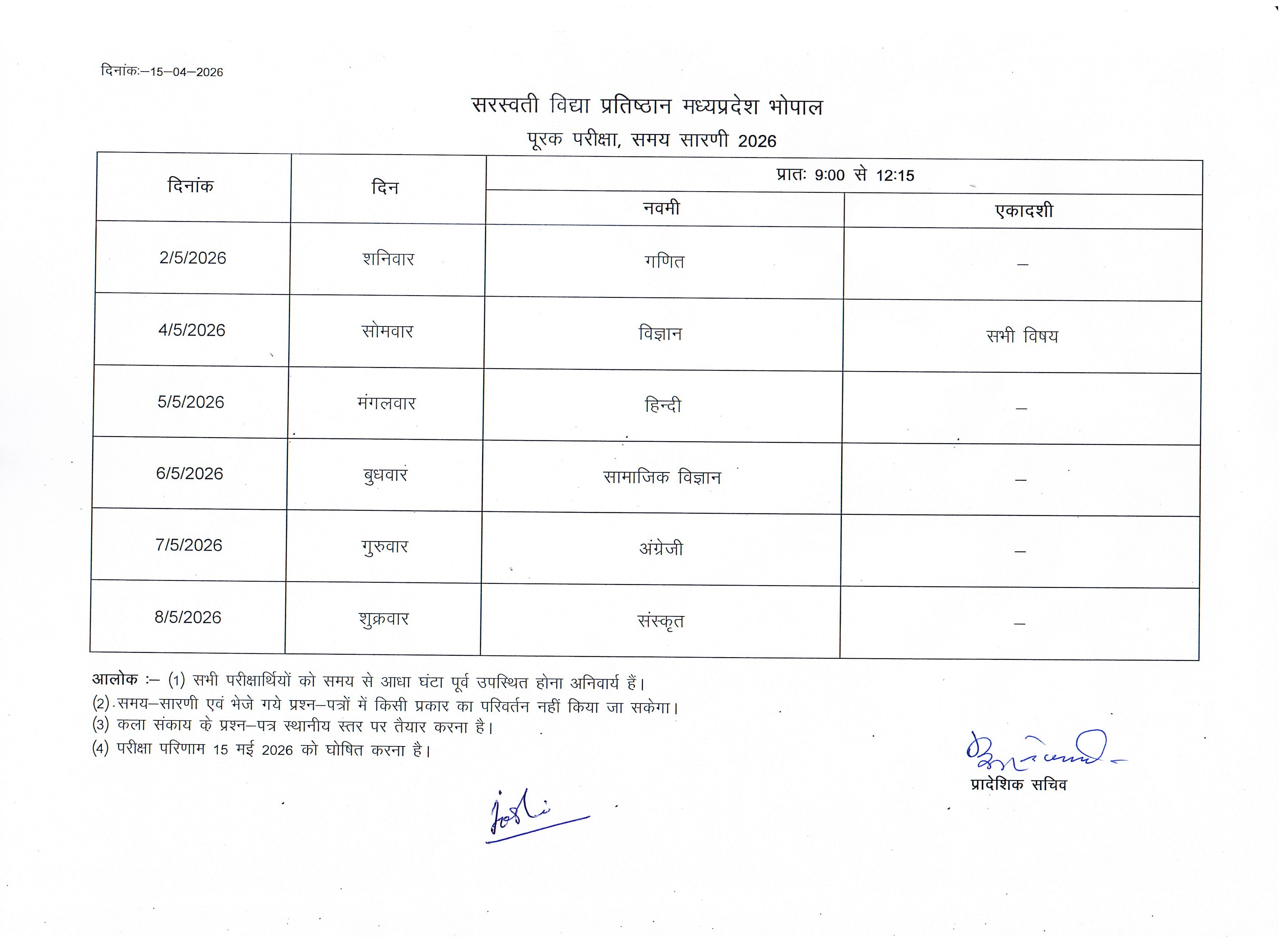 विशेष जाँच मूल्यांकन (परीक्षा) समय सारणी 2026